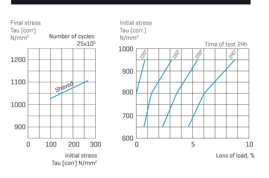 Diagram 2 shows the relaxation properties (loss of load) of springs made from SWOSC-VHV wire subjected to static compression at different temperatures.